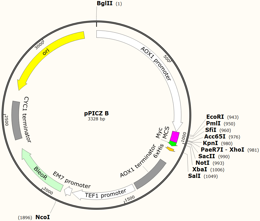 pPICZ A,B和C是3.3 kb的畢赤酵母蛋白載體。表達的重組蛋白是融合蛋白,含有一個C-端多肽,多太重含c-myc和C-His標簽。載體能夠在畢赤酵母中利用甲醇誘導(dǎo)的高水平的表達目的蛋白,并且可以用在任何畢赤酵母中,包括X33,GS115菌株,SMD1168H,KM71H。