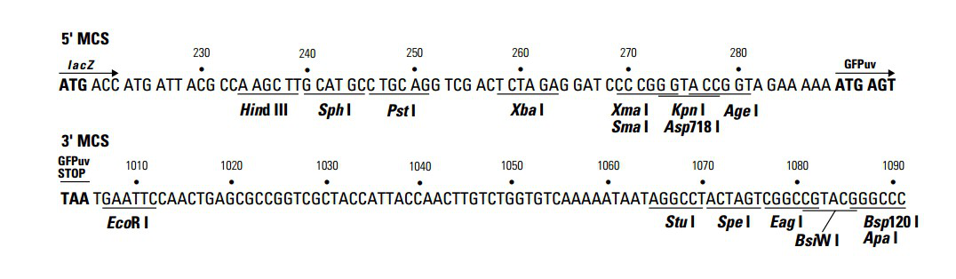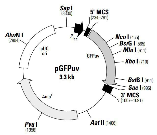 pGFPuv encodes a variant of Aequorea victoria green fluorescent protein (GFP) that has been optimized for brighter fluorescence when excited by standard UV light. The GFPuv coding sequence is flanked by separate MCSes at the 5' and 3' ends, so the GFPuv gene can be excised from pGFPuv. Alternatively, the GFPuv coding sequences can be amplified by PCR.
