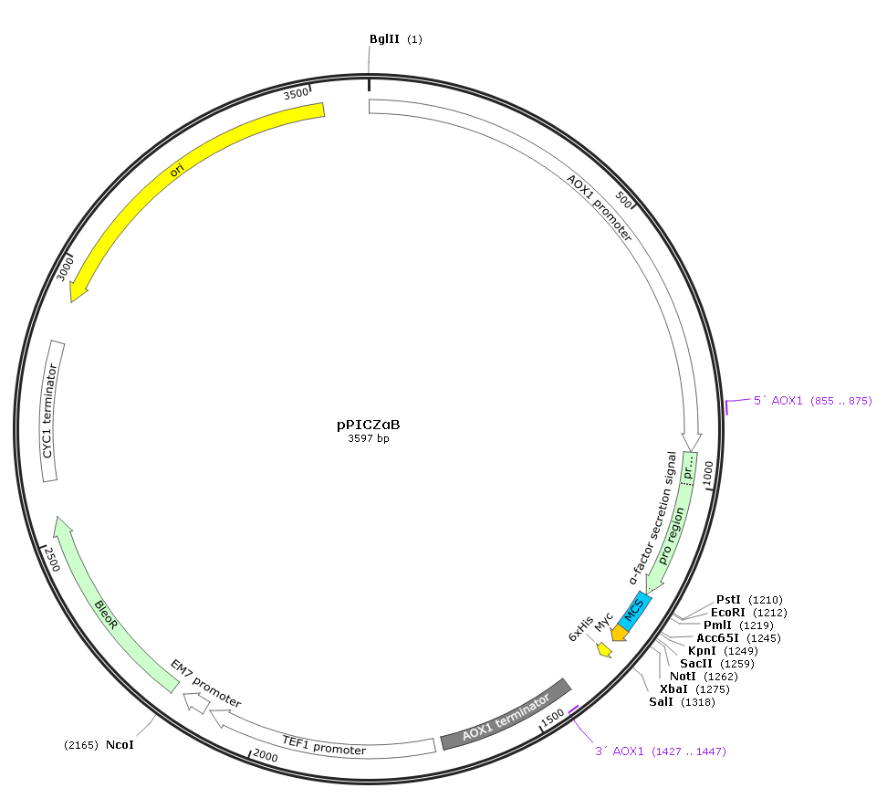 pPICZαA,B和C是3.6 kb的畢赤酵母蛋白分泌表達(dá)載體。表達(dá)的重組蛋白是融合蛋白,含有一個(gè)N-端多肽,編碼釀酒酵母(Saccharomyces cerevisiae)α-因子分泌信號(hào)。載體能夠在畢赤酵母中利用甲醇誘導(dǎo)的高水 平的表達(dá)目的蛋白,并且可以用在任何畢赤酵母中,包括X33,GS115菌株,SMD1168H,KM71H。