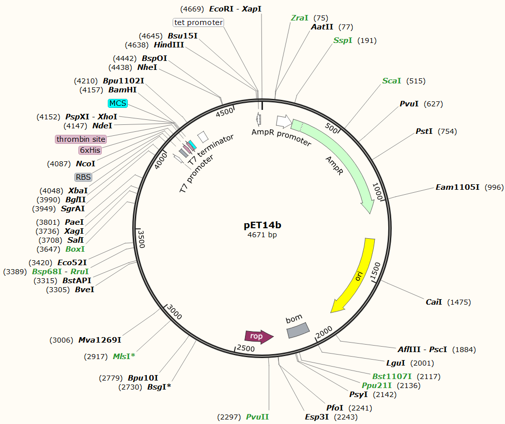 The pET-14b vector carries an N-terminal His?Tag? sequence followed by a thrombin site and three cloning sites. Unique sites are shown on the circle map.