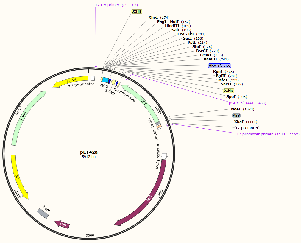 pET42a載體的單一的多克隆位點(diǎn)見(jiàn)上面的環(huán)狀質(zhì)粒圖譜。注意:載體序列是以pBR322質(zhì)粒的編碼規(guī)矩進(jìn)行編碼的,所以T7蛋白表達(dá)區(qū)在質(zhì)粒圖譜上面是反向的。T7 RNA聚合酶啟動(dòng)的克隆和表達(dá)區(qū)域在質(zhì)粒圖譜中也被標(biāo)注了出來(lái)。質(zhì)粒的F1復(fù)制子是被定向的,所以在T7噬菌體聚合酶的作用下,包含有蛋白編碼序列的病毒 粒子能夠產(chǎn)生,并啟動(dòng)蛋白表達(dá),同時(shí)蛋白表達(dá)將被T7終止子序列的作用下終止蛋白翻譯。