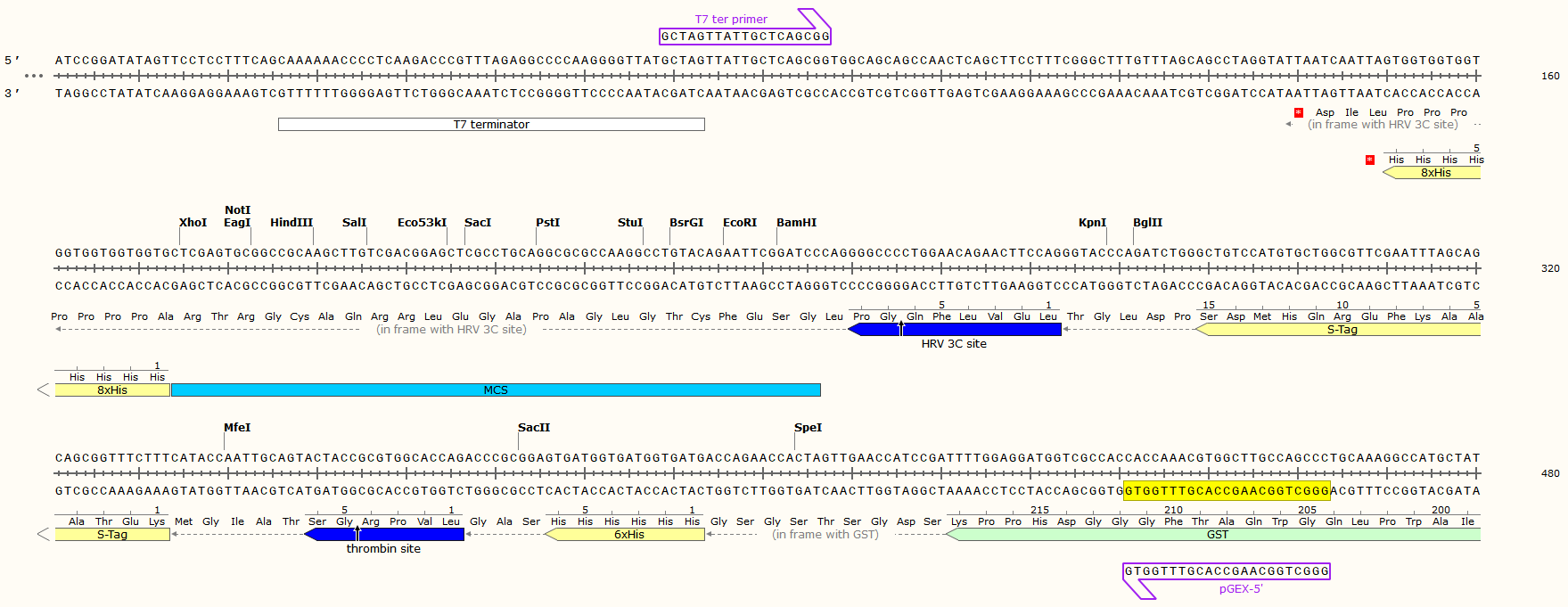 | 5' 測(cè)序引物: | T7: 5'-TAATACGACTCACTATAGGG-3'; pGEX-5': 5'-GGGCTGGCAAGCCACGTTTGGTG-3' |